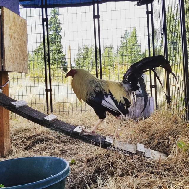 Both birds are Red Junglefowl, which is very old breed that was domesticated over 5,000 years ago. There is evidence that this breed was the original chicken breed found in the Pacific at 3,000 BC! This is a very healthy and long living breed with a possible lifespan of thirty years! We look forward to being the home for Zeus and Demeter for a long long time.